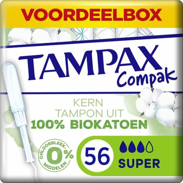 De kern van Tampax Cotton Protection Compak tampons is gemaakt van 100% biologisch katoen. Het zijn de beste tampons uit het Tampax assortiment voor comfort en bescherming. Ze bevatten geen parfum, geen kleurstoffen en geen chloorbleekmiddelen. Hun inbrenghuls heeft een afgeronde top voor gemakkelijk inbrengen. Tampax Cotton Protection Compak heeft MotionFit-technologie waardoor de tampon lichtjes uitzet en zich aan de unieke vorm van je lichaam aanpast. Daarnaast helpt het LeakGuard-koordje lekken voorkomen. De Tampax Cotton Protection Compak Super is Super tampons zijn ideaal voor een gemiddelde tot zware menstruatie.. Tampax Cotton Protection Compak tampons zijn getest door gynaecologen. Ze zijn ook onafhankelijk getest op schadelijke stoffen door OEKO-TEX STANDARD 100 en gecertificeerd veilig in gebruik.Ga naar de website van Tampax voor meer informatie over de producten.